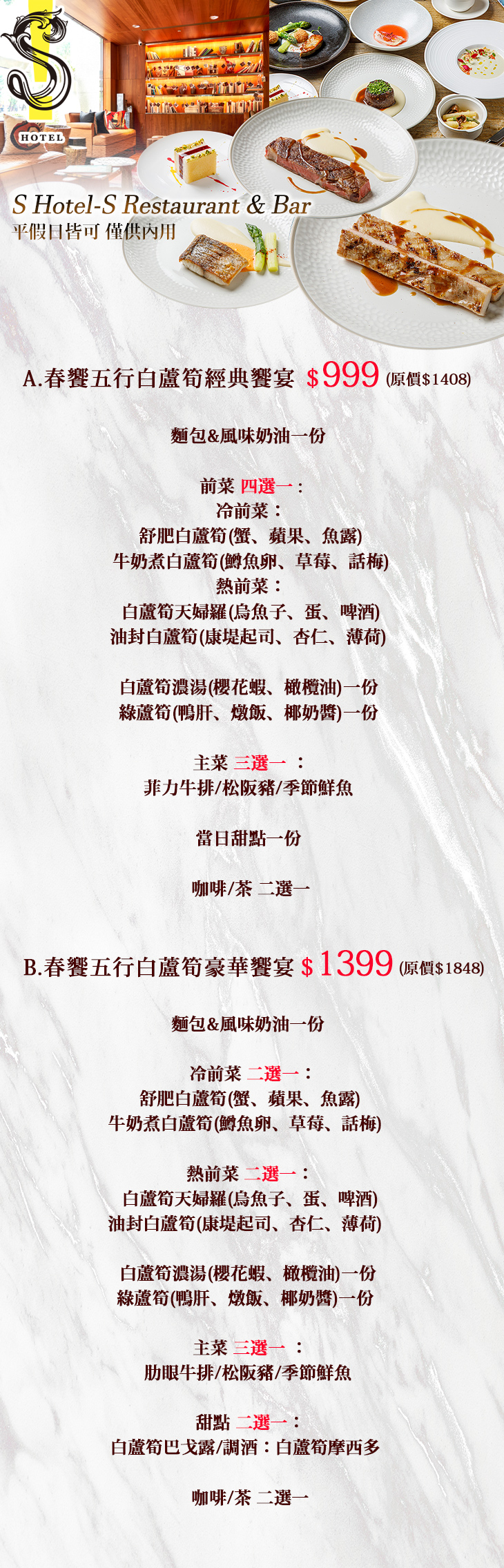 〈麵包&風味奶油一份 + 冷前菜:舒肥白蘆筍(蟹、蘋果、魚露)/牛奶煮白蘆筍(鱒魚卵、草莓、話梅)/熱前菜:白蘆筍天婦羅(烏魚子、蛋、啤酒)/油封白蘆筍(康堤起司、杏仁、薄荷) 四選一 + 白蘆筍濃湯(櫻花蝦、橄欖油)一份 + 綠蘆筍(鴨肝、燉飯、椰奶醬)一份 + 主菜:菲力牛排/松阪豬/季節鮮魚 三選一 + 當日甜點一份 + 咖啡/茶 二選一〉