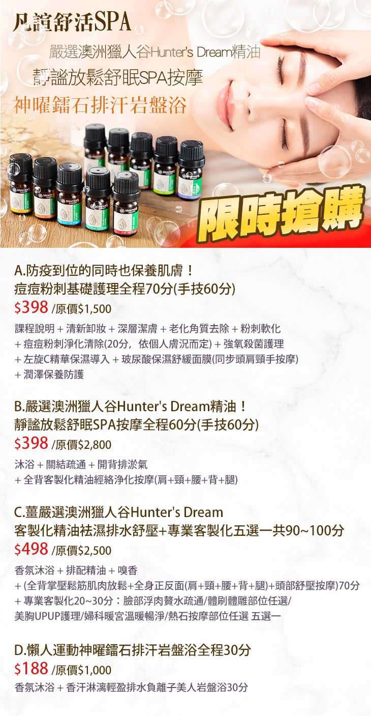 A.防疫到位的同時也保養肌膚!痘痘粉刺基礎護理全程70分(手技60分) / B.嚴選澳洲獵人谷Hunter's Dream精油!靜謐放鬆舒眠SPA按摩全程60分(手技60分) / C.薑嚴選澳洲獵人谷Hunter's Dream客製化精油袪濕排水舒壓+專業客製化五選一共90~100分 / D.懶人運動神曜鐳石排汗岩盤浴全程30分