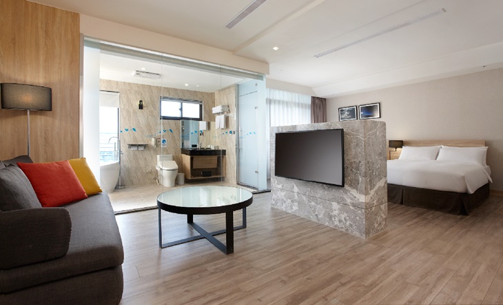 光線透過寬幅落地窗恣意流淌,木質空間舒緩放鬆,採光絕美乾濕分離浴室、圓弧曲線蛋型浴缸、無隔間一房一廳設計、雙液晶電視等,給您絕佳的放鬆空間!另有獨立陽台飽覽市景,享受輕鬆愉快的親子時光。