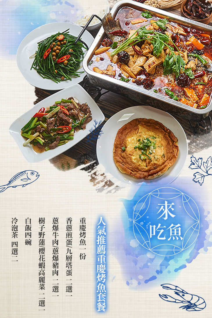 重慶烤魚一份 + 香蔥煎蛋/九層塔蛋 二選一 + 蔥爆牛肉/蔥爆豬肉 二選一 + 樹子野蓮/櫻花蝦高麗菜 二選一 + 白飯四碗 + 冷泡茶四選二