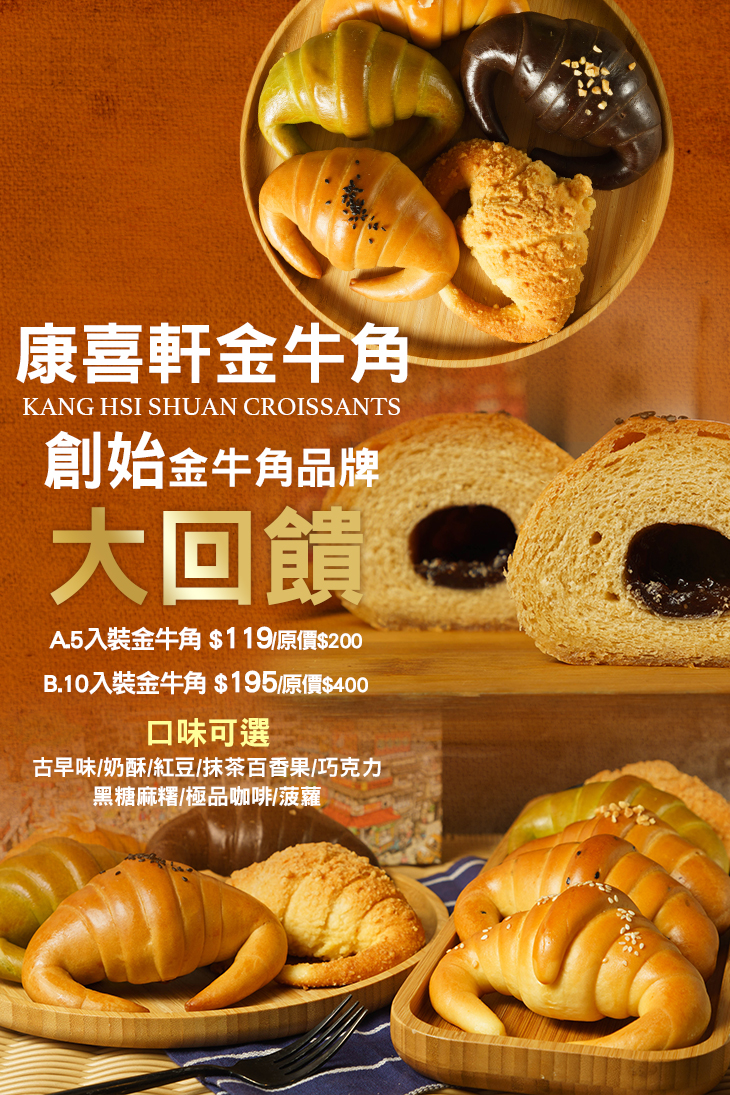 風靡大街小巷的人氣美食!這檔錯過,絕對讓您直呼可惜喲!在台擁有眾多分店的【康喜軒金牛角】,希望顧客從「認識金牛角」、「相信金牛角」到「愛上金牛角」,因此不斷改良產品品質,強調健康與衛生。抱持著「用心」、「愛心」、「專心」、「良心」這四心生產店內每項產品,不惜成本堅決使用法國進口發酵奶油、加拿大小麥以及100%乳品製作口味獨特的金牛角牛角麵包。康喜軒將在地的三峽老街文化融入到包裝禮盒中,讓每個來到三峽老街的遊客品嚐到口感獨特的金牛角之外也能進而了解三峽老街的文化與故事。