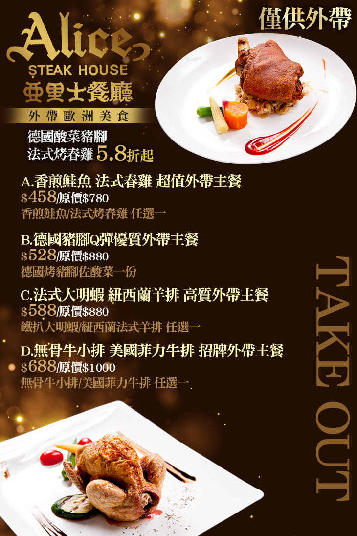 A.香煎鮭魚 法式春雞 超值外帶主餐 / B.德國豬腳Q彈優質外帶主餐 / C.法式大明蝦 紐西蘭羊排 高質外帶主餐 / D.無骨牛小排 美國菲力牛排 招牌外帶主餐