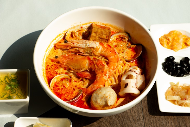 南洋風味的叻沙海鮮湯麵,香氣醇厚、綿延,搭配海鮮一同享用很是對味!鮮甜的蝦子、飽滿的蛤蜊,在各種香料的入味下別有一番風味,讓原本清爽的海鮮風味變得鮮濃,越吃越香。
