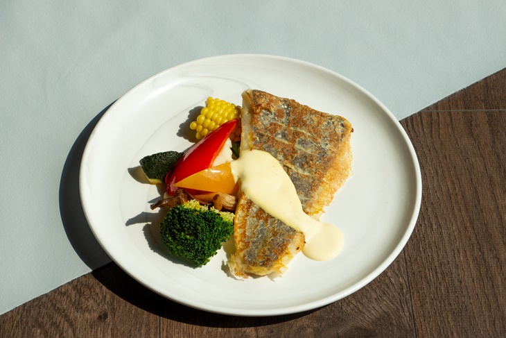 使用品質優良的魚料理。透過主廚精湛的手藝用心烹調,煎至恰好的熟度後盛盤上桌,熟度恰如其分的肉質,柔軟且緊實有彈性,於味蕾之上綻放自然鮮甜,搭配蔬菜與醬汁,為整體擺盤更添高貴的氣息,五星等級的奢華饗宴,不沾任何調味料也韻味無窮!