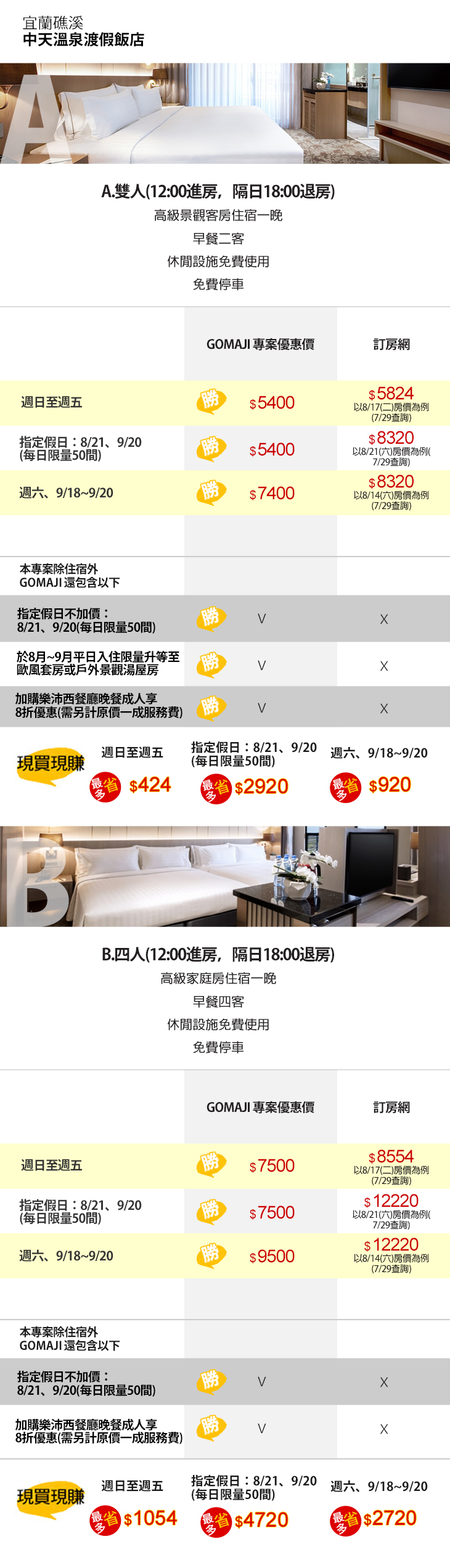 ※ 麻吉好康:A方案於8月~9月平日入住限量升等至歐風套房或戶外景觀湯屋房