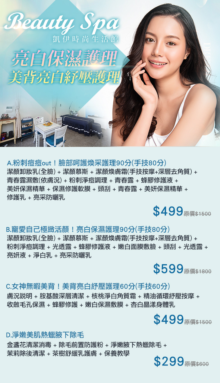 A.粉刺痘痘out!臉部呵護煥采護理90分(手技80分) / B.寵愛自己極緻活顏!亮白保濕護理90分(手技80分) / C.女神無暇美背!美背亮白紓壓護理60分(手技60分) / D.淨嫩美肌熱蠟腋下除毛