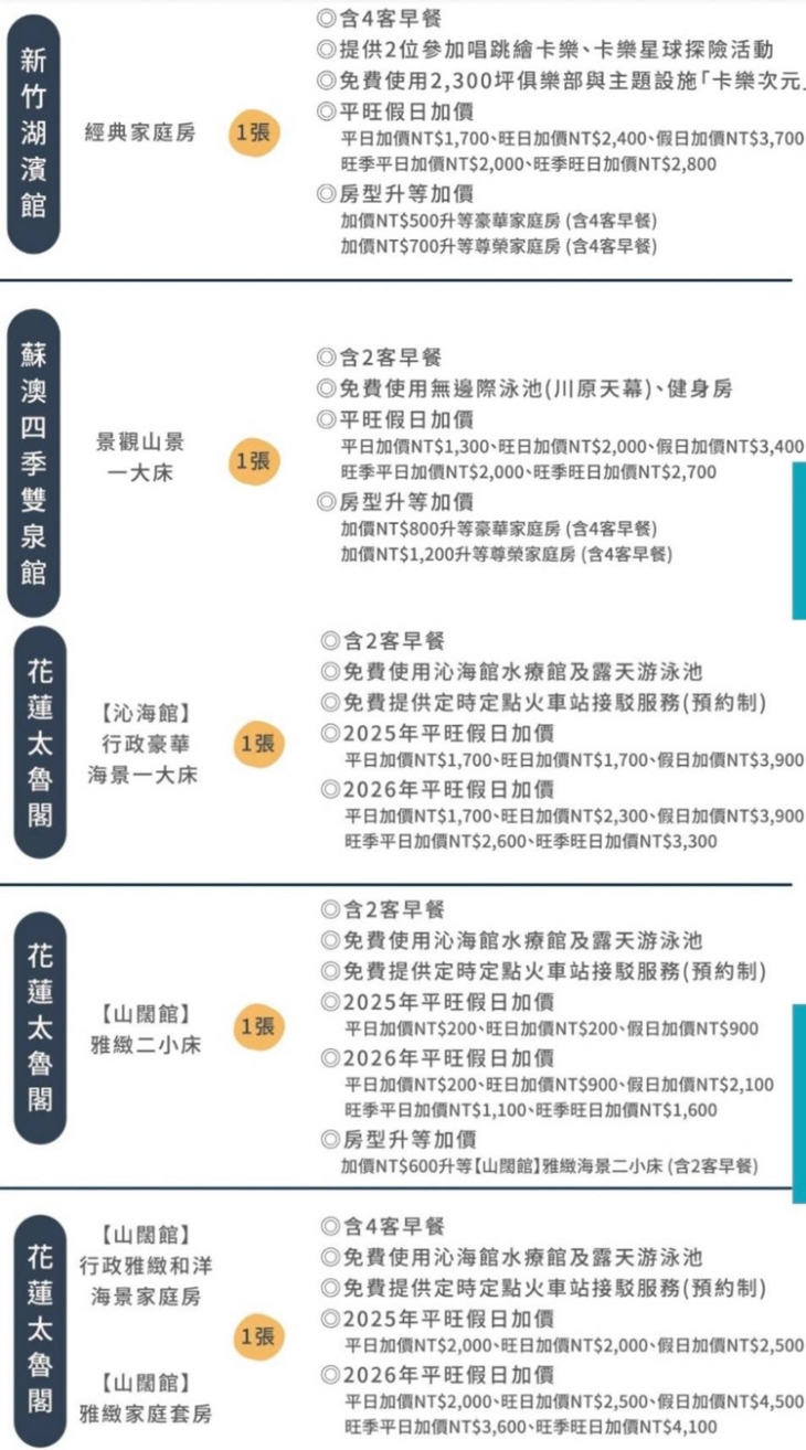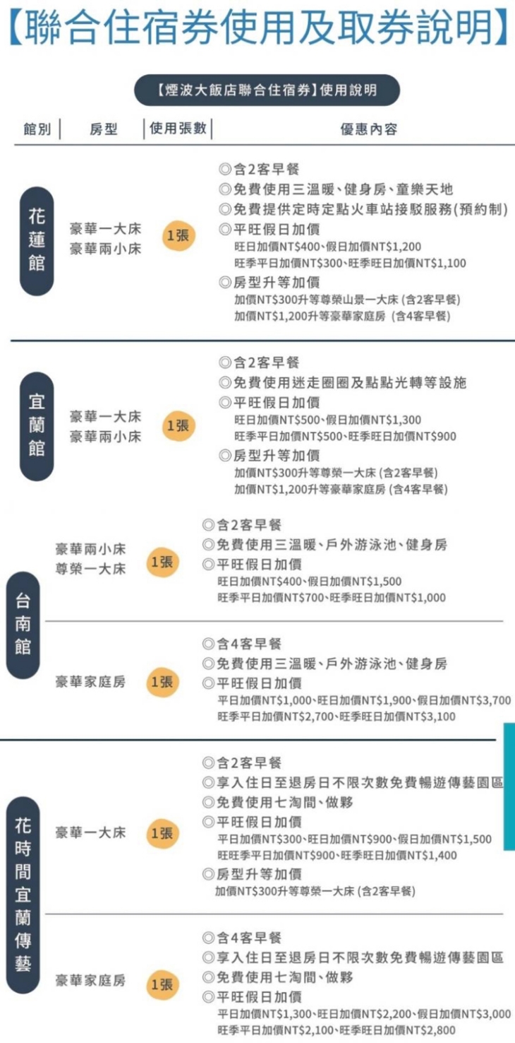 只要2999元,即可享有【煙波大飯店】聯合住宿券,全台八館通用(新竹湖濱/台南/宜蘭/蘇澳/花時間宜蘭傳藝/花蓮/花蓮太魯閣(沁海/山闊館))
