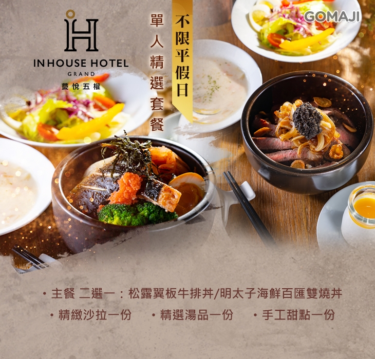 〈主餐:松露翼板牛排丼/明太子海鮮百匯雙燒丼 二選一 + 精緻沙拉一份 + 精選湯品一份 + 手工甜點一份〉