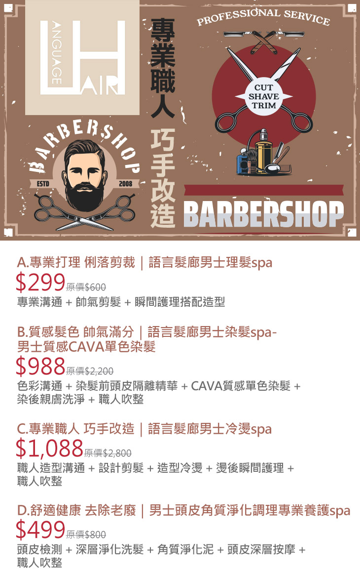A.專業打理 俐落剪裁|語言髮廊男士理髮spa / B.質感髮色 帥氣滿分|語言髮廊男士染髮spa-男士質感CAVA單色染髮 / C.專業職人 巧手改造|語言髮廊男士冷燙spa / D.舒適健康 去除老廢|男士頭皮角質淨化調理專業養護spa
