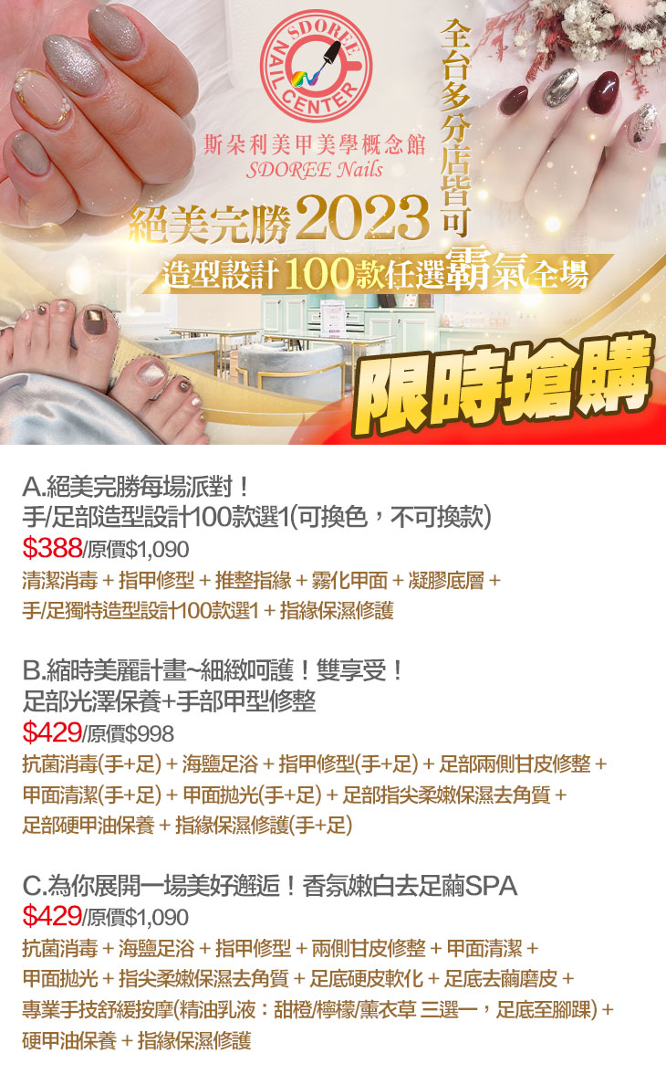 A.絕美完勝每場派對!手/足部造型設計100款選1(可換色,不可換款) / B.縮時美麗計畫~細緻呵護!雙享受!足部光澤保養+手部甲型修整 / C.為你展開一場美好邂逅!香氛嫩白去足繭SPA