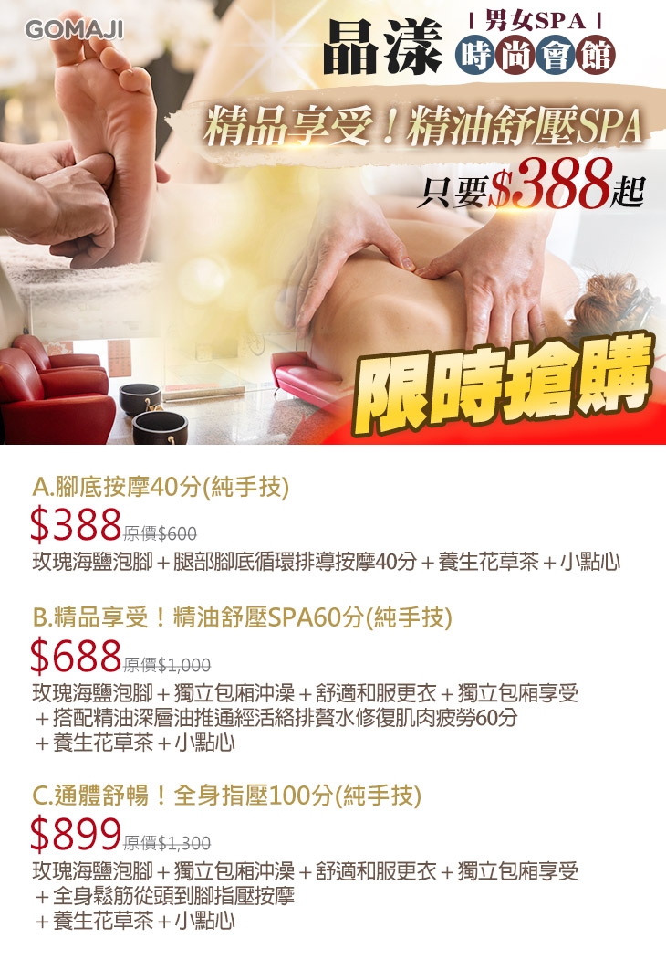 先透過溫熱適中、芬芳宜人的玫瑰海鹽泡腳,一點一滴舒緩您緊繃的情緒,接著藉由精準到位的腳底按摩,刺激您的足底反射區,又酥又麻的感覺逐漸爬上心頭,讓人痠爽難耐~按完後,雙足的腫脹、疲勞都消失了,帶您找回輕盈的腳程!