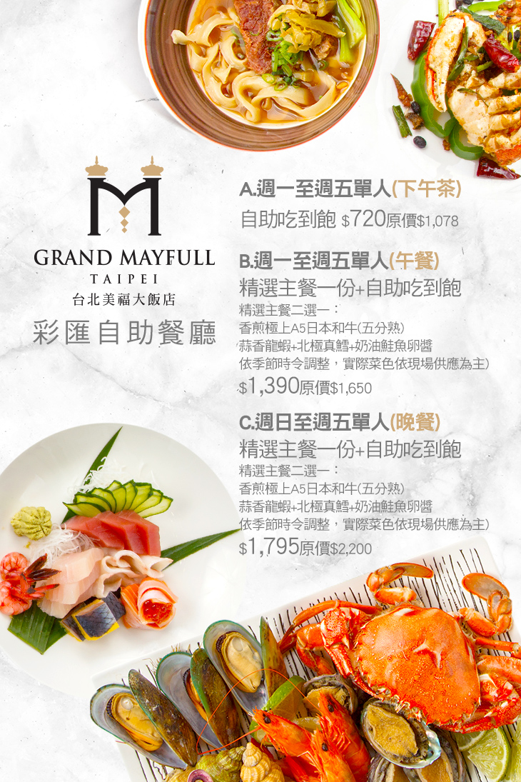 A.週一至週五單人(下午茶)自助吃到飽 / B.週一至週五單人(午餐)精選主餐一份+自助吃到飽 / C.週日至週五單人(晚餐)精選主餐一份+自助吃到飽