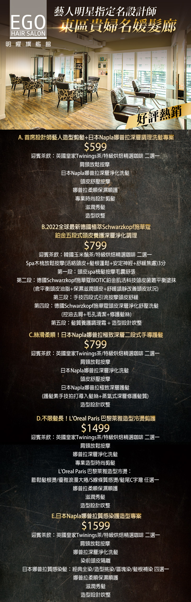 A.藝人指定首席設計師造型剪髮+日本Napla娜普拉深層調理洗髮專案 / B.2022全球最新德國植萃Schwarzkopf施華蔻鉑金五段式頭皮養護深層淨化調理 / C.絲滑柔順!日本Napla娜普拉極致深層二段式手導護髮 / D.不限髮長!L'Oreal Paris 巴黎萊雅造型冷燙剪護 / E.日本Napla娜普拉質感染護造型專案