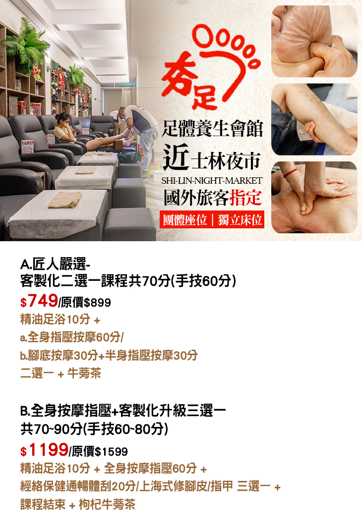 【夯足士林會館】士林夜市最夯足體按摩,結合書香藝文空間,將台灣的按摩技術與精神推廣至國際間,讓世界各地來台北的旅客都能體會到夯足師傅技術的專業與美好。服務以顧客至上為主要宗旨,奉上養生茶、精油沐足,提供溫馨舒適的環境,並以平價高品質按摩技術來做口碑!
