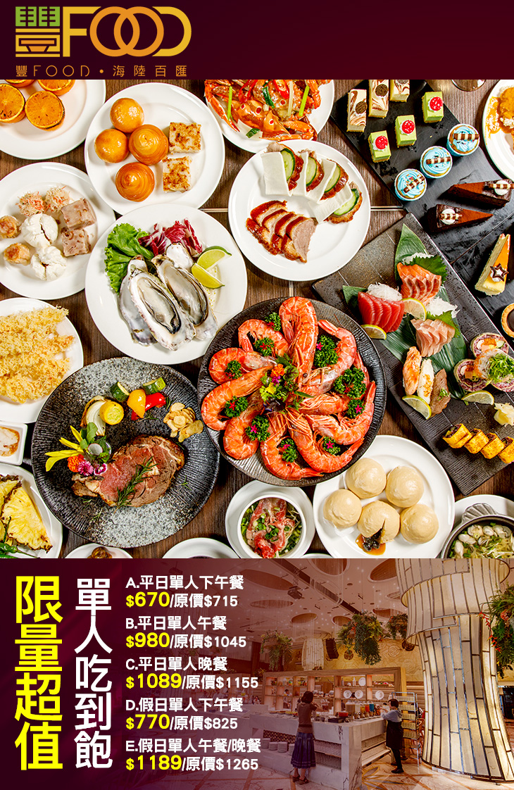 A.平日單人下午餐自助吃到飽 / B.平日單人午餐自助吃到飽 / C.平日單人晚餐自助吃到飽 / D.假日單人下午餐自助吃到飽 / E.假日單人午餐/晚餐自助吃到飽