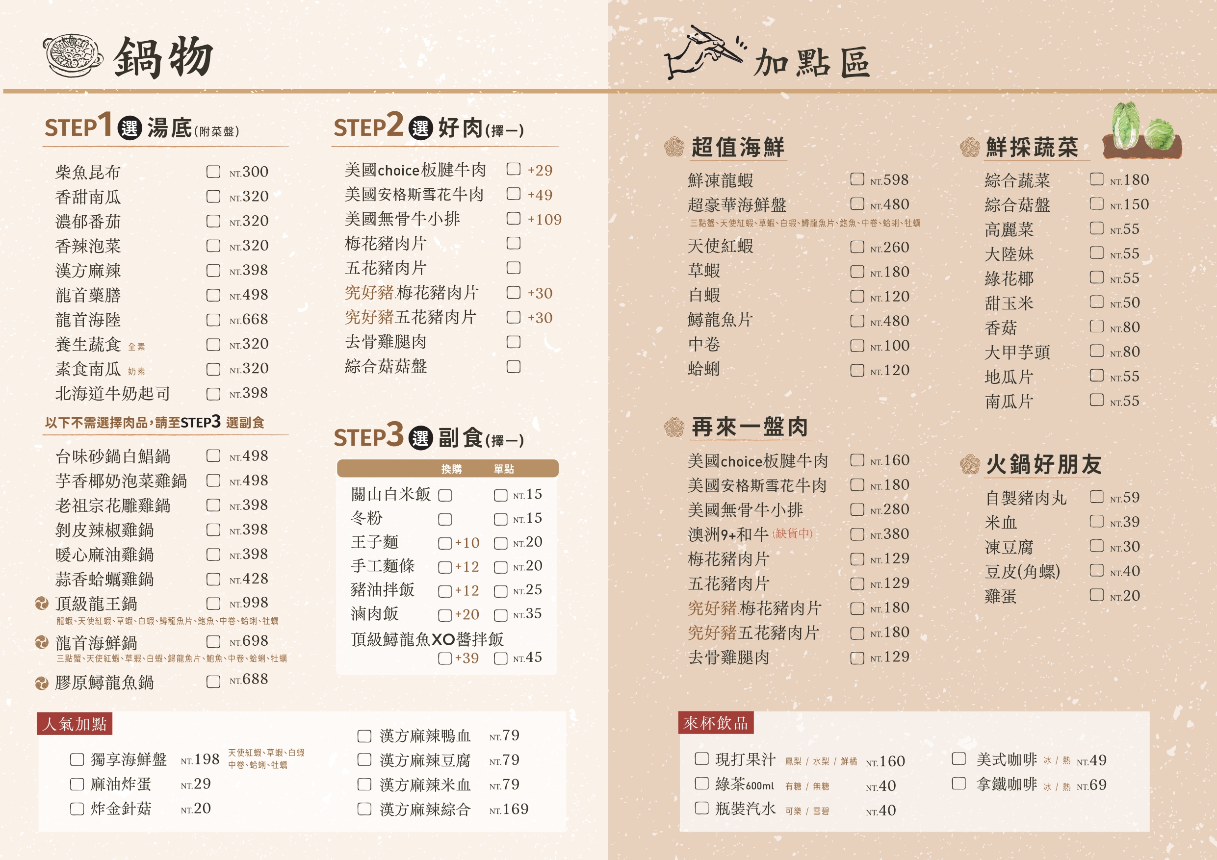 奶白色的湯水,入口釋放醇厚的奶香,加上金黃起司增色,彼此交融出濃厚但不膩口的絕品湯頭!涮入清甜的時蔬或者鮮美的肉片享用,豐富的鍋物饗宴,讓人大飽口福!