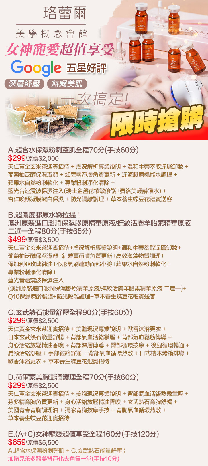 A.超含水保濕粉刺整肌全程70分(手技60分) / B.超濃度膠原水嫩拉提!澳洲原裝進口澎潤保濕膠原精華原液/撫紋活膚羊胎素精華原液 二選一全程80分(手技65分) / C.玄武熱石能量舒壓全程90分(手技60分) / D.荷爾蒙美胸澎潤護理全程70分(手技60分) / E.(A+C)女神寵愛超值享受全程160分(手技120分)