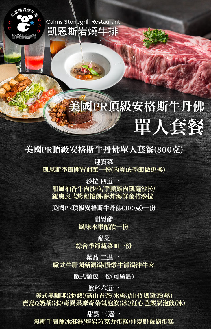 【凱恩斯岩燒牛排】以岩燒為基礎烹調方式,提供多樣澳洲與美國紅肉類、白肉類、海鮮與素食餐點。引進最自然的烹調方法,尋求最新鮮的食材,是【凱恩斯岩燒牛排】二十幾年來唯一的堅持 ~ 讓您品嚐到每一口都是熱呼呼的鮮甜與飽滿,就是凱恩斯岩燒牛排的魅力!