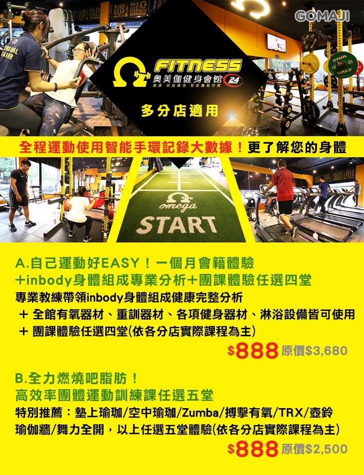 A.單人立即GO!一個月會籍體驗+inbody身體組成專業分析+團課體驗任選四堂 / B.全力燃燒吧脂肪!高效率團體運動訓練課任選五堂