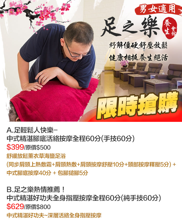 A.足輕鬆人快樂-中式精湛腳底活絡按摩全程60分(手技60分) / B.足之樂熱情推薦!中式精湛好功夫全身指壓按摩全程60分(純手技60分)