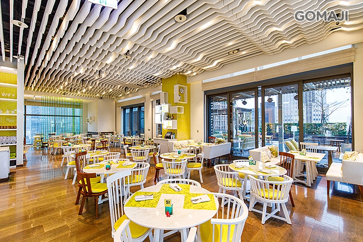 位於 10 樓的 the kitchen table 西餐廳採用明亮輕快的花園空間設計,以鮮明的嫩黃色與清爽的白色為主,添加時尚現代氣息,牆上蝴蝶造型的瓷盤裝置藝術向外飛去,環繞台北W飯店,象徵此餐廳自然迷人的風采。