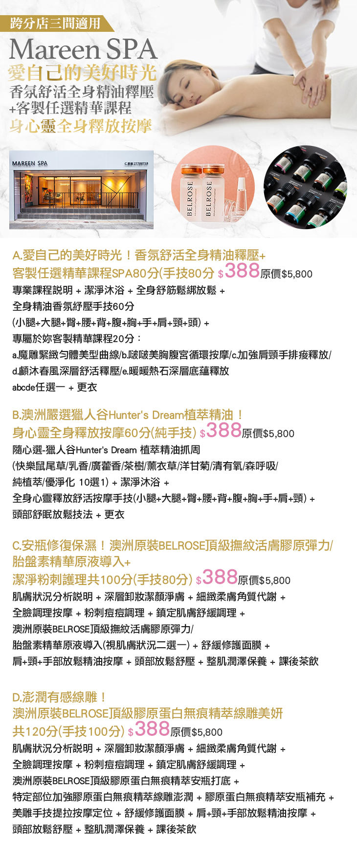 A.愛自己的美好時光!香氛舒活全身精油釋壓+客製任選精華課程SPA80分(手技80分) / B.澳洲嚴選獵人谷Hunter's Dream植萃精油!身心靈全身釋放按摩60分(純手技) / C.安瓶修復保濕!澳洲原裝BELROSE頂級撫紋活膚膠原彈力/胎盤素精華原液導入+潔淨粉刺護理共100分(手技80分) / D.澎潤有感線雕!澳洲原裝BELROSE頂級膠原蛋白無痕精萃線雕美妍共120分(手技100分)