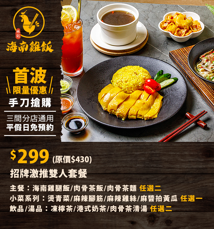 〈主餐:海南雞腿飯/肉骨茶飯/肉骨茶麵 任選二 + 小菜系列:燙青菜/麻辣腳筋/麻辣雞絲/麻醬拍黃瓜 任選一 + 飲品/湯品:凍檸茶/港式奶茶/肉骨茶清湯 任選二〉