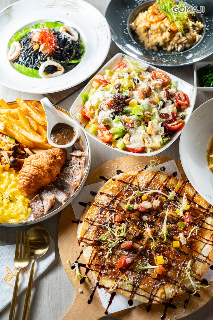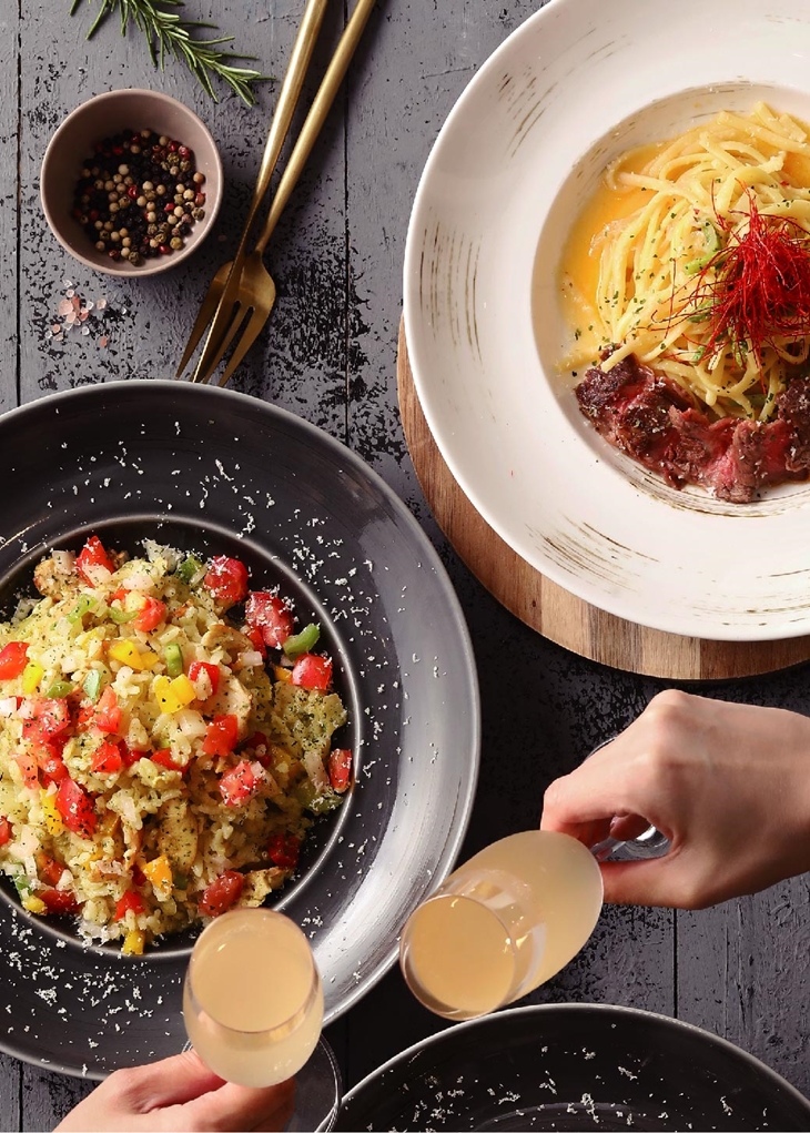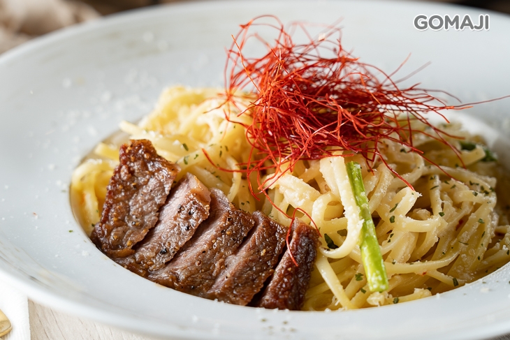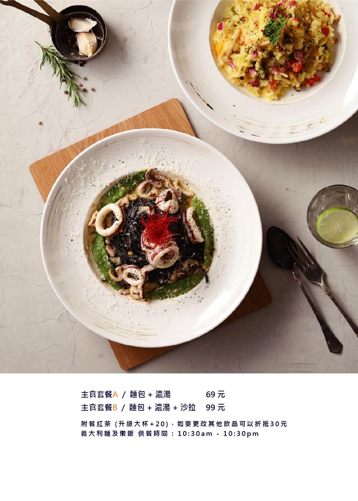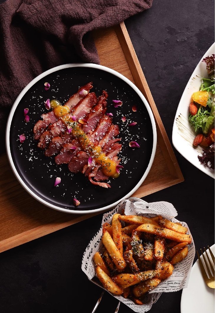 選用香鹹夠味的客家鹹蛋黃,加上新鮮彈牙的中卷,巧妙入料至墨黑色的義大利麵條中,創造出前所未見的義式創意料理!讓台灣在地的金沙風味,將義大利麵條調味得鹹香濃郁,別有一番風味~這一道充滿主廚巧思的金沙中卷義大利麵,必嚐無疑!