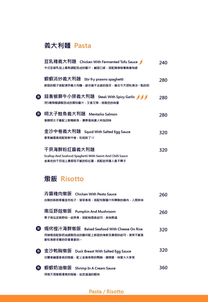 將熱水汆燙過的Q彈義大利麵,加入五種辣椒調製而成的獨特醬汁細心烹炒,讓麵條條條入味,又香又辣,一端上桌,辛香開胃的氣味便撲鼻而來,令人垂涎三尺,入口品嚐,那充滿層次的辛辣滋味不斷挑逗味蕾,並為舌間帶來陣陣酥麻的快感,實在過癮!如果您喜歡吃辣,那您絕對不能錯過這一道!