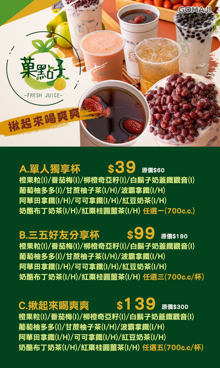〈橙果粒(I)/番茄梅(I)/柳橙奇亞籽(I)/白鬍子奶蓋鐵觀音(I)/葡萄柚多多(I)/甘蔗柚子茶(I/H)/波霸拿鐵(I/H)/阿華田拿鐵(I/H)/可可拿鐵(I/H)/紅豆奶茶(I/H)/奶酪布丁奶茶(I/H)/紅棗桂圓薑茶(I/H) 任選五(700c.c/杯)〉