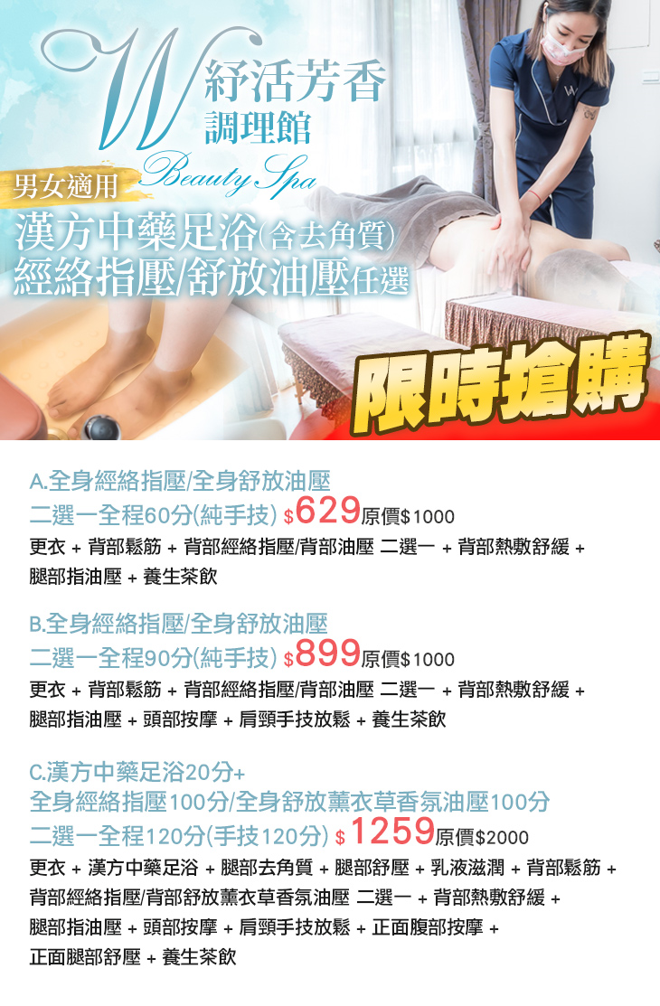 A.全身經絡指壓/全身舒放油壓 二選一全程60分(純手技) / B.全身經絡指壓/全身舒放油壓 二選一全程90分(純手技) / C.漢方中藥足浴20分+全身經絡指壓100分/全身舒放薰衣草香氛油壓100分 二選一全程120分(手技120分)