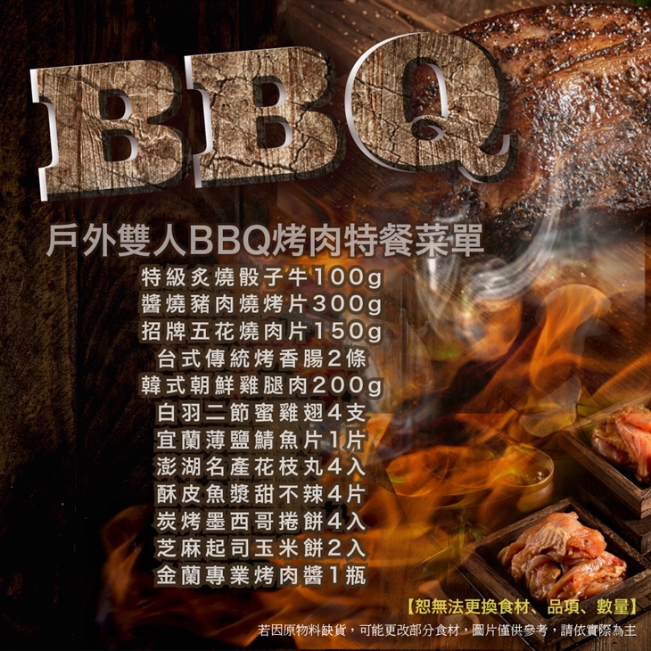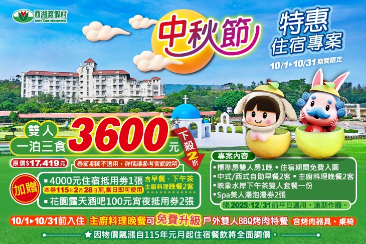 10月入住:主廚料理晚餐可免費升級戶外雙人BBQ烤肉特餐(含烤肉器具、桌椅),恕無法更換食材、品項、數量;中秋連假(10/04~10/06)烤肉活動時間:16:30~21:00(配合中秋晚會),其餘日期烤肉活動時間:17:00~20:00
