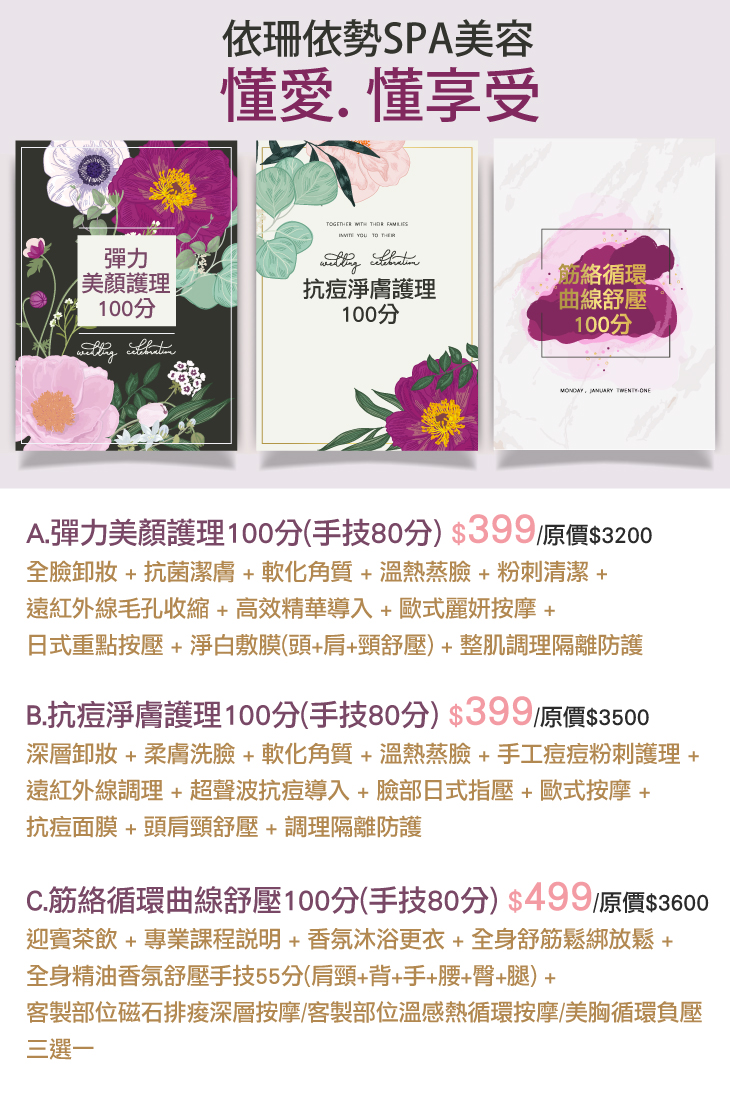 A.彈力美顏護理100分(手技80分) / B.抗痘淨膚護理100分(手技80分) / C.筋絡循環曲線舒壓100分(手技80分)