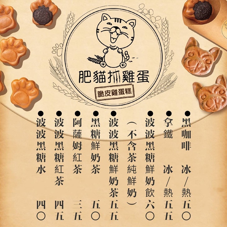 有著可愛店名的【肥貓抓雞蛋】,成立於2015年,身為貓奴的老闆從市集起家,為了想讓更多人吃到美味的甜點而選擇開店,因口味特別、平價美味等多項優點,在2020年還登上了日本雜誌,被譽為台中必吃的雞蛋糕店呢!店內專賣熱騰騰的現烤脆皮雞蛋糕,堅持選用最好、最新鮮的食材製作,並致力研發多種創意口味,從黑糖QQ、OREO、蜜蘋果通通都有,外皮酥香、餡料美味的好滋味,擄獲了不少顧客的心,除了雞蛋糕外,還有好喝的飲品可以搭配享用唷!吃的喝的一次滿足,心動不如行動,一起來吃好料吧!