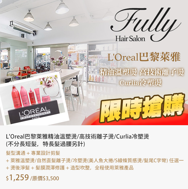 L'Oreal巴黎萊雅精油溫塑燙/高技術離子燙/Curlia冷塑燙(不分長短髮,特長髮過腰另計)