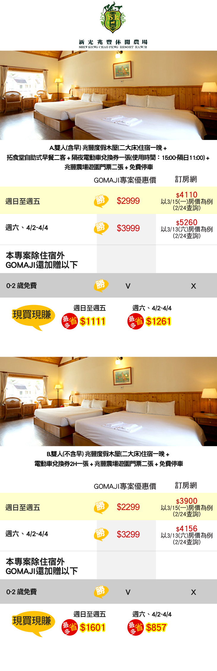 ★ 花蓮超夯親子遊,暢遊兆豐農場,入住木屋二大床,第三、四人可加人加價使用!