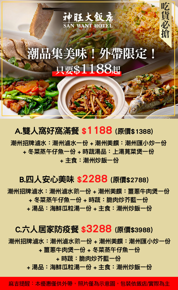 挑選一份人數符合的潮州風味套餐,搭配多樣的精緻料理,各道都飽含職人的功夫與用心,道道都是值得細品的經典之作!讓您在家也能打造出專屬宴席,感受前所未有的滿足,絕對讓您大飽口福!