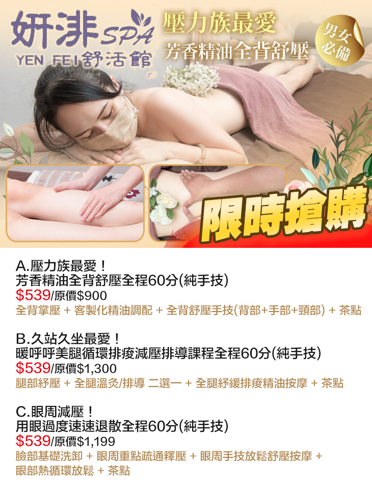 A.壓力族最愛!芳香精油全背舒壓全程60分(純手技) / B.久站久坐最愛!暖呼呼美腿循環排痠減壓排導課程全程60分(純手技) / C.眼周減壓!用眼過度速速退散全程60分(純手技)