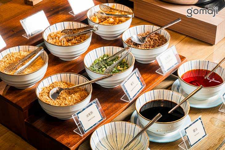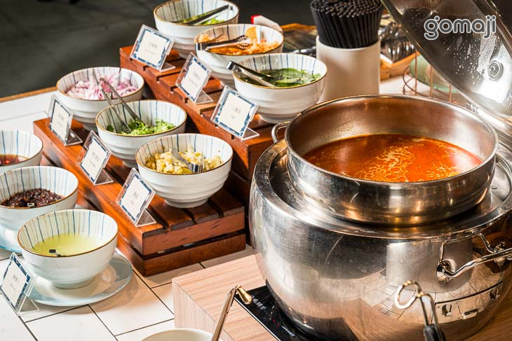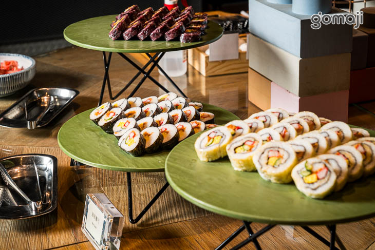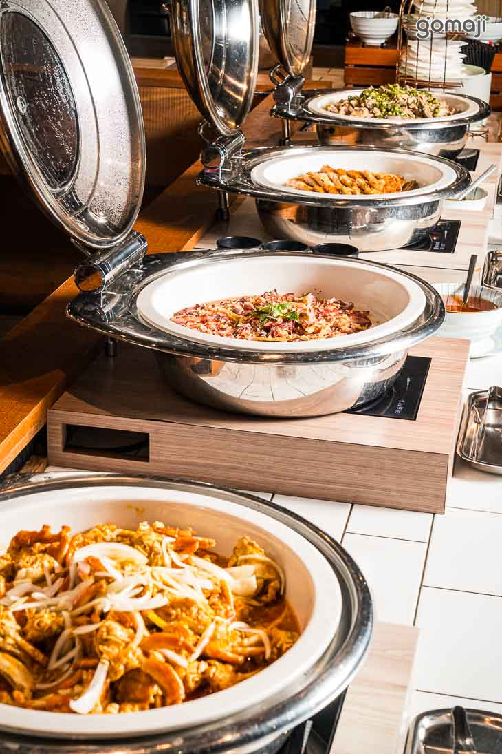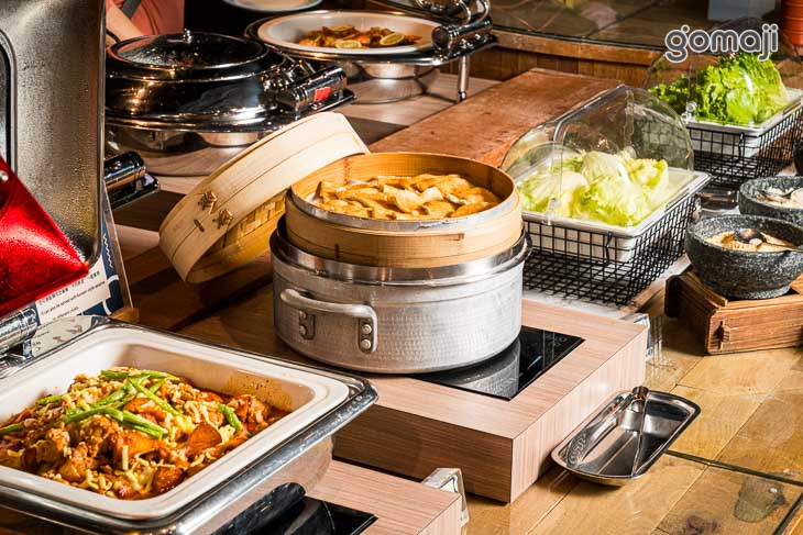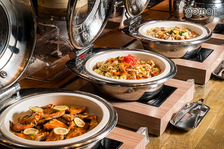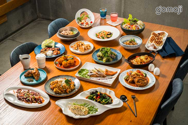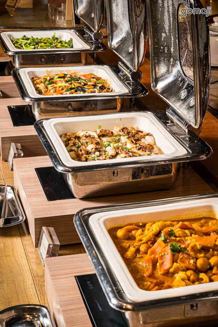 餐檯提供中、西、日、韓、東南亞等五大主題異國料理,品項應有盡有,還有星巴克喝到飽,以及現做甜點、鬆餅、Häagen-Daz等多元選擇,讓賓客盡情享受美食佳餚。