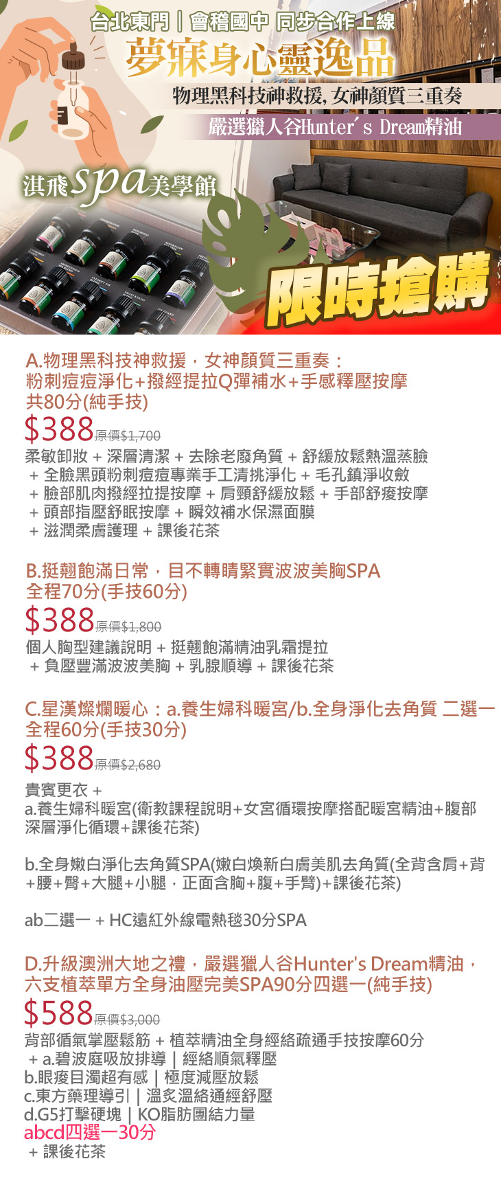 A.物理黑科技神救援,女神顏質三重奏:粉刺痘痘淨化+撥經提拉Q彈補水+手感釋壓按摩共80分(純手技) / B.挺翹飽滿日常,目不轉睛緊實波波美胸SPA全程70分(手技60分) / C.星漢燦爛暖心:a.養生婦科暖宮/b.全身淨化去角質 二選一全程60分(手技30分) / D.升級澳洲大地之禮,嚴選獵人谷Hunter's Dream精油,六支植萃單方全身油壓完美SPA90分四選一(純手技)