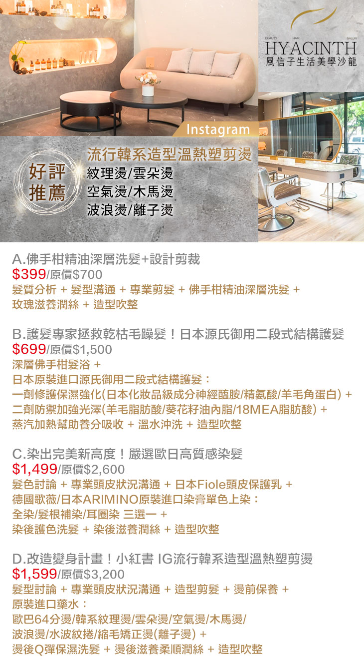 A.佛手柑精油深層洗髮+設計剪裁 / B.護髮專家拯救乾枯毛躁髮!日本源氏御用二段式結構護髮 / C.染出完美新高度!嚴選歐日高質感染髮 / D.改造變身計畫!小紅書 IG流行韓系造型溫熱塑剪燙