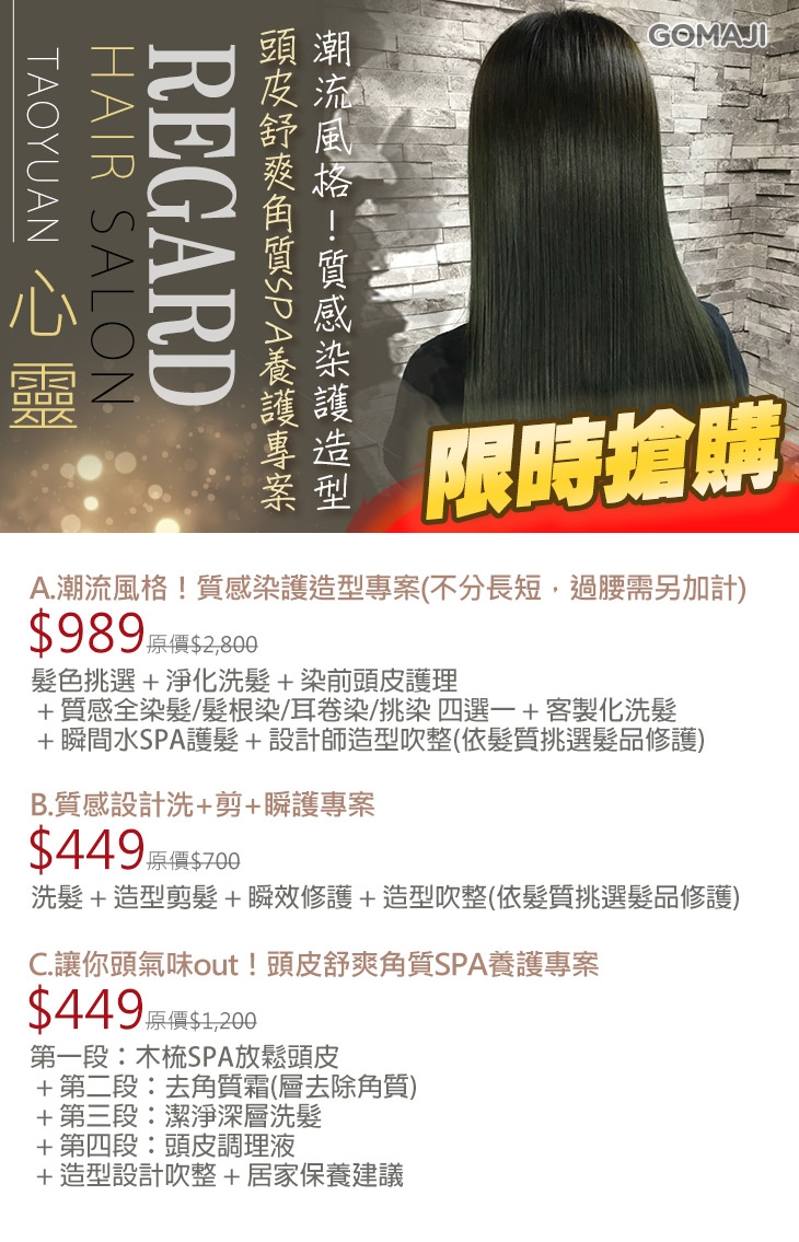 A.潮流風格!質感染護造型專案(不分長短,過腰另計) / B.質感設計洗+剪+瞬護專案 / C.讓你頭氣味out!頭皮舒爽角質SPA養護專案