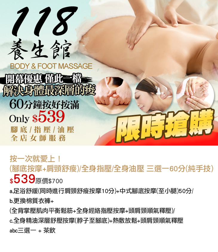 按一次就愛上!(腳底按摩+肩頸舒痠)/全身指壓/全身油壓 三選一60分(純手技)