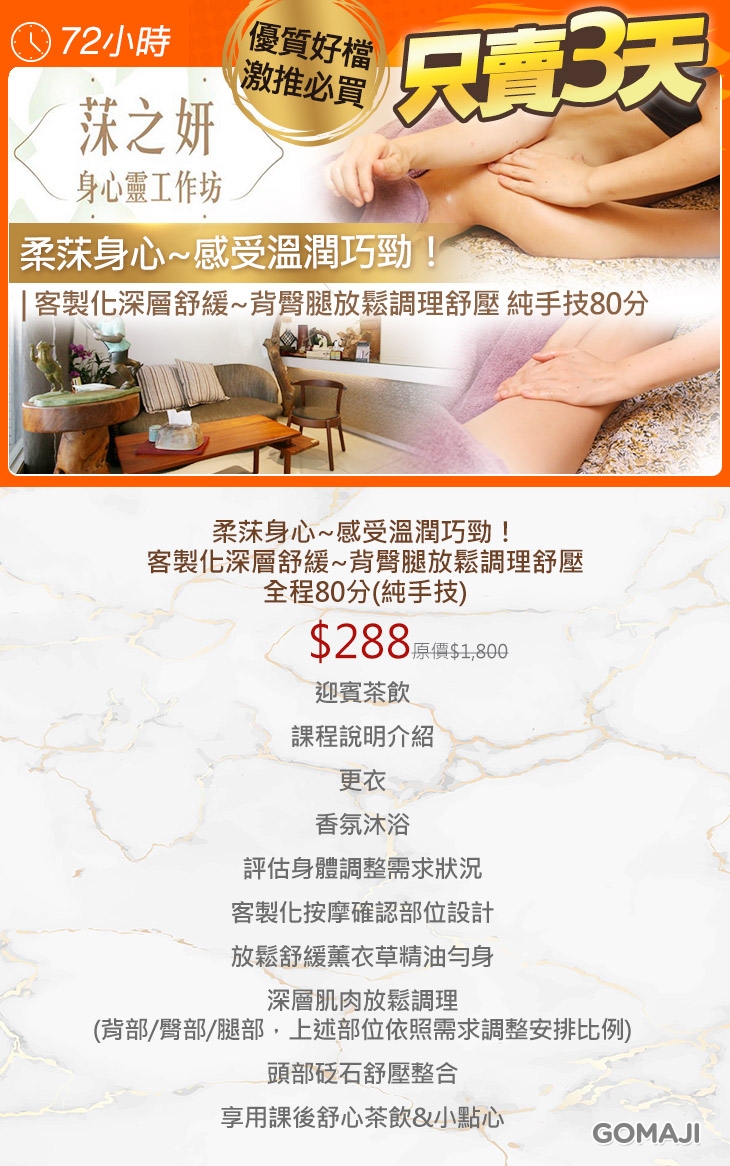 柔莯身心~感受溫潤巧勁!客製化深層舒緩~背臀腿放鬆調理舒壓全程80分