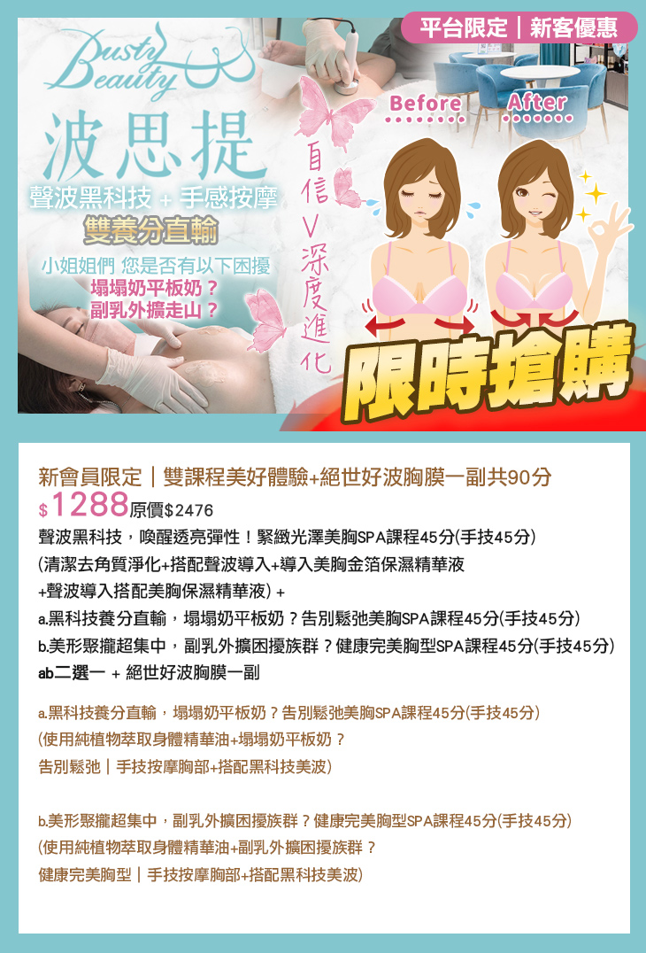 小孩子才做選擇!【Busty Beauty 波思提美胸】為新會員預備了超值的雙享方案,讓初次體驗的朋友,能用優惠的價位體驗全方位的美胸SPA~除了基本的肌膚保養外,依照您的需求選擇針對胸型鬆弛或者胸型外擴的按摩手法,細膩的流程,一步、一步照料好您的胸部,給您最舒適的幸福時光。