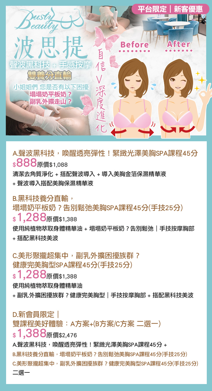 A.聲波黑科技,喚醒透亮彈性!緊緻光澤美胸SPA課程45分 / B.黑科技養分直輸,塌塌奶平板奶?告別鬆弛美胸SPA課程45分(手技25分) / C.美形聚攏超集中,副乳外擴困擾族群?健康完美胸型SPA課程45分(手技25分) / D.新會員限定|雙課程美好體驗:A方案+(B方案/C方案 二選一)
