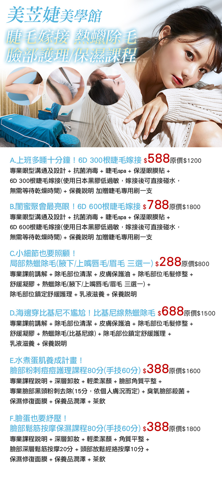 A.上班多睡十分鐘!6D 300根睫毛嫁接 / B.閨蜜聚會最亮眼!6D 600根睫毛嫁接 / C.小細節也要照顧!局部熱蠟除毛(腋下/上嘴唇毛/眉毛 三選一) / D.海邊穿比基尼不尷尬!比基尼線熱蠟除毛 / E.水煮蛋肌養成計畫!臉部粉刺痘痘護理課程80分(手技60分) / F.臉蛋也要紓壓!臉部鬆筋按摩保濕課程80分(手技60分)