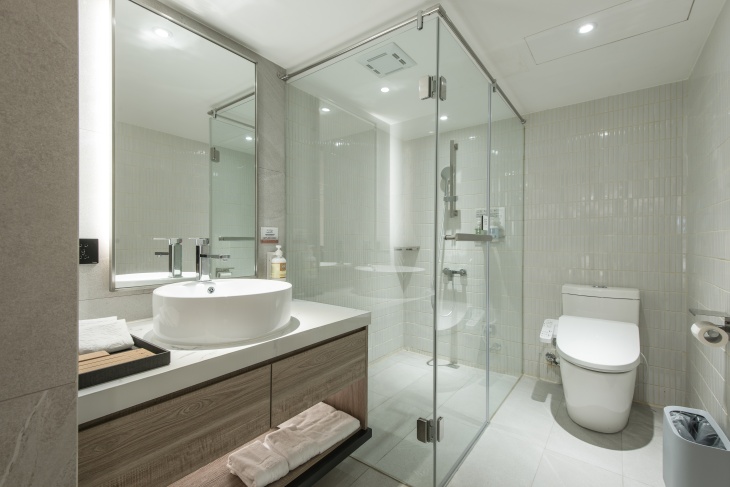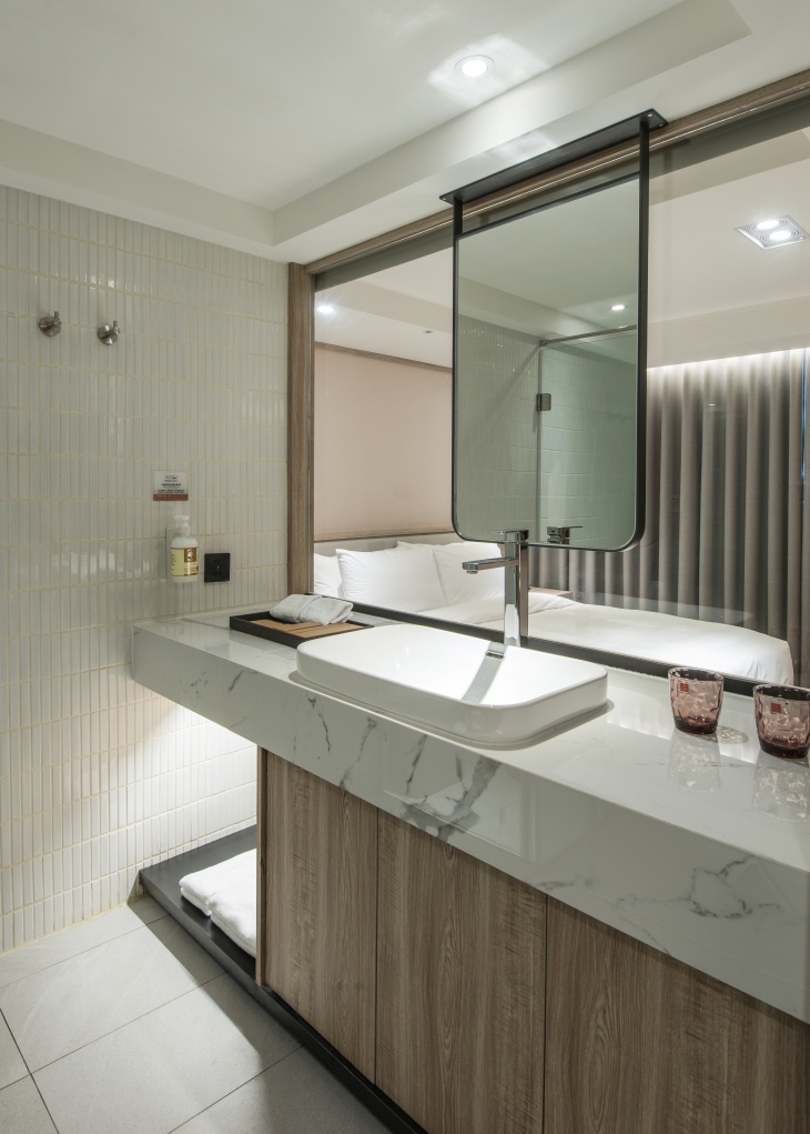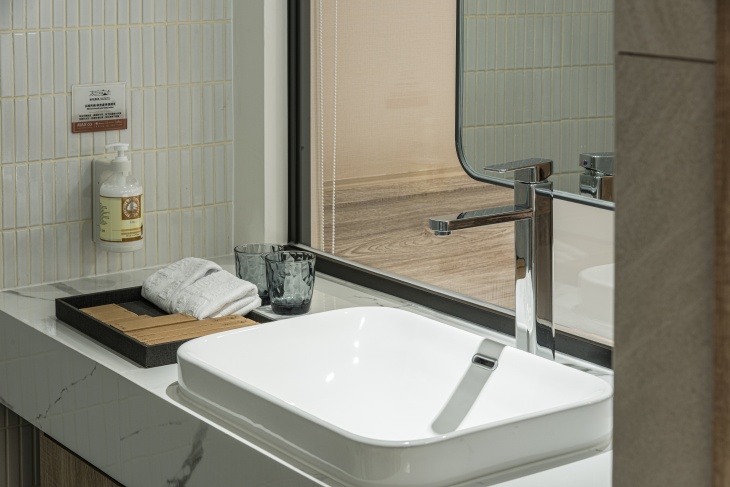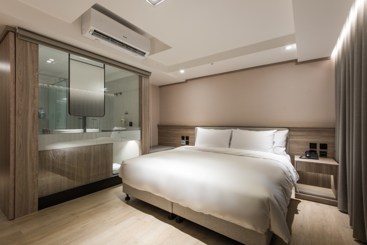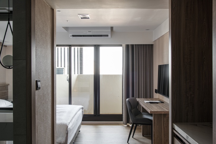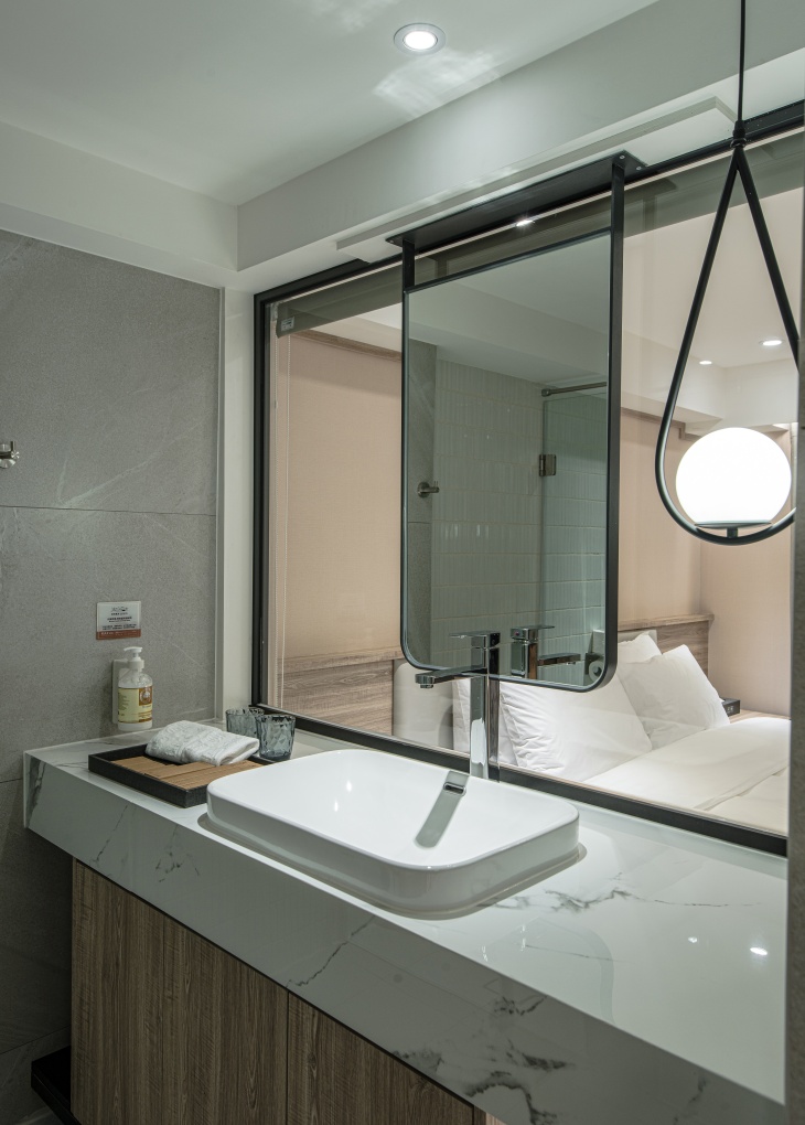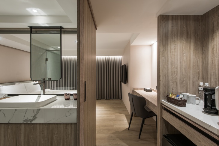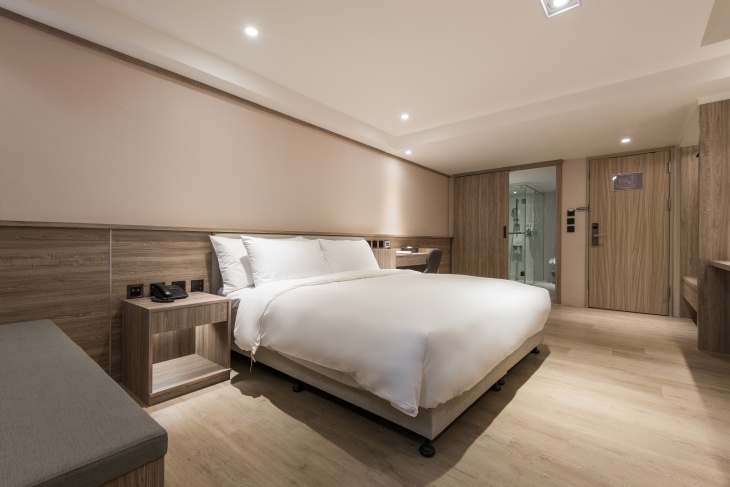 以暖色調與木質元素打造簡約雅緻的空間,呈現低調卻不失質感的氛圍。房內配置一張寬敞舒適的加大雙人床,搭配舒適枕墊與溫潤觸感的寢具,讓旅客能徹底放鬆,享受深度好眠。大片落地窗旁設有遮光窗簾,可依心情選擇開放或隱私,白天引入柔和自然光,夜晚則讓房間更添靜謐。房內附有長書桌與舒適座椅,無論是商務辦公或閱讀休憩都十分便利。衛浴空間採乾濕分離設計,以玻璃隔間搭配亮潔磁磚,視覺清爽且動線流暢,兼具實用與質感。整體空間寬敞明亮,從臥室到浴室皆展現現代設計的細膩巧思。無論是情侶、夫妻浪漫入住,或是商務旅客的舒心歇腳,都能帶來安穩而放鬆的住宿體驗。