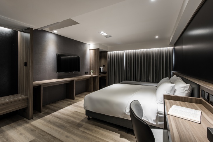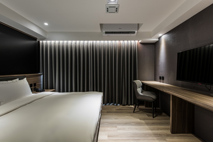 整體以深木質調搭配柔和燈光,營造沉穩靜謐的氛圍,特別適合需要安靜休息或專注工作的旅客。高品質雙人大床搭配潔白床品,視覺與觸感皆散發出舒適質感,床頭牆面採用深色設計,不僅增加層次感,也讓夜晚更顯安定。大片遮光窗簾後方隱藏著自然採光的窗景,白天可引入柔和日光,夜晚則有效隔絕光源,營造良好的睡眠環境~