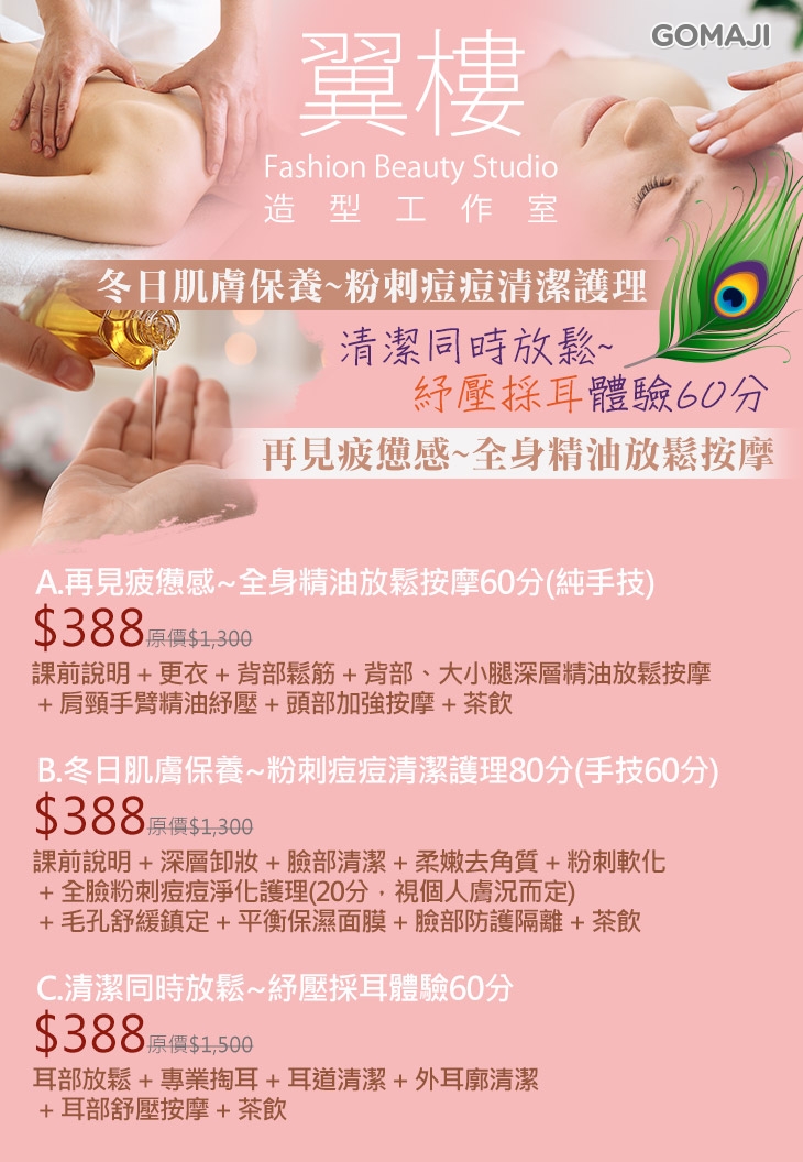 A.再見疲憊感~全身精油放鬆按摩60分(純手技) / B.冬日肌膚保養~粉刺痘痘清潔護理80分(手技60分) / C.清潔同時放鬆~紓壓採耳體驗60分